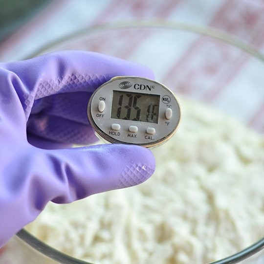 - Stir occasionally and make sure the internal temperature of the cheese is around 57 degrees Celsius.