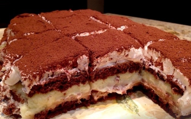• Top layer: Whip the whipping cream with the stabilizer and powdered sugar. Spread the cream evenly over the top of the sponge. Sprinkle the dessert with cocoa powder.