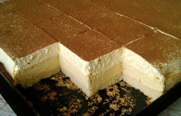 - Assembling the ice cake: Spread the prepared cream over the cooled base and then the homemade whipped cream. You can sprinkle the cake with cocoa to taste.