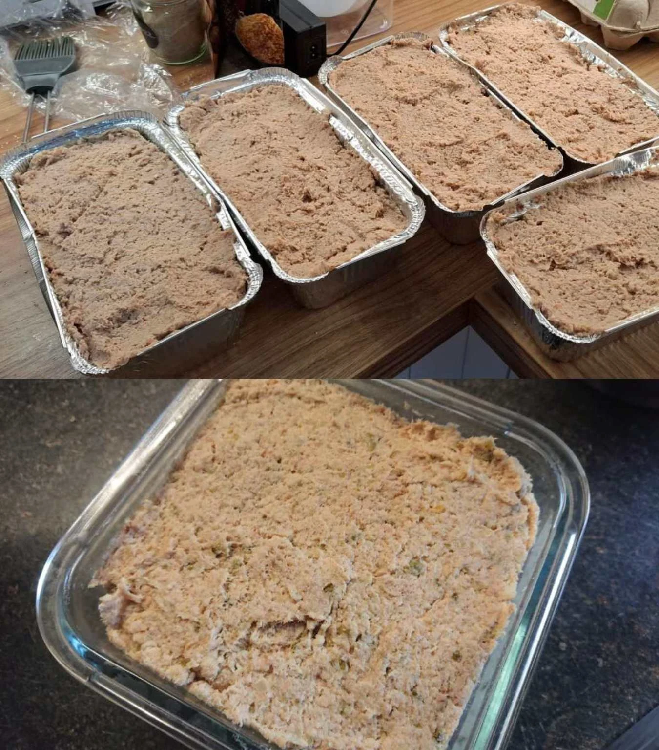 • Folding in lard pieces and filling the molds If you reserved some of the lard in larger pieces, now is the right moment to gently fold it into the blended pâté — it will give a delicate “melting” effect in every bite. Divide the finished mixture into greased ceramic ramekins, small baking dishes or one larger terrine mold. Smooth the surface with a spatula.