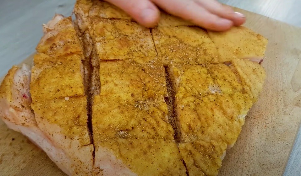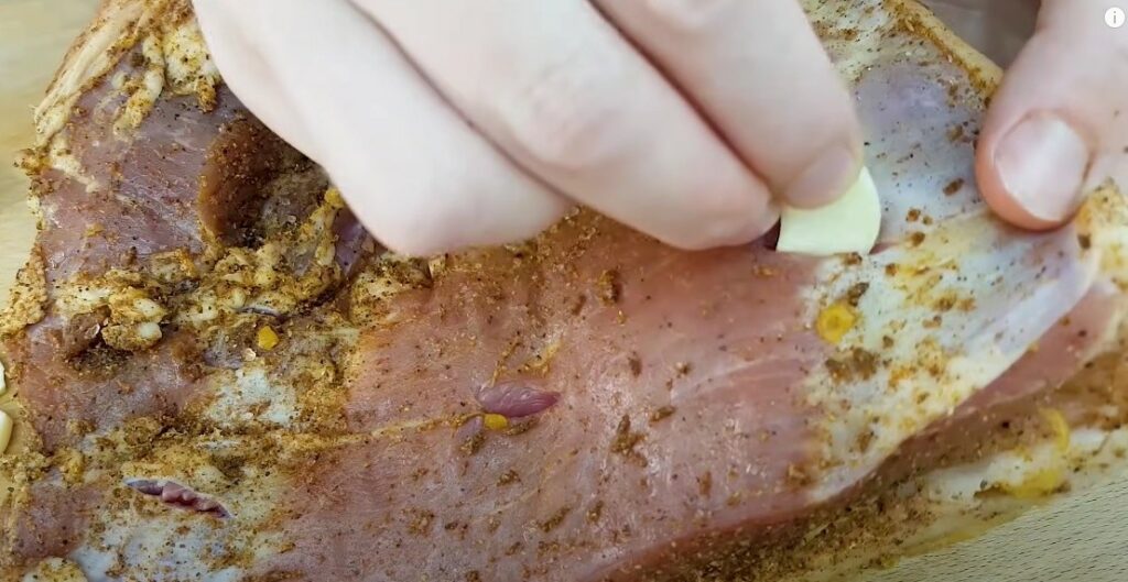 • In a bowl, add salt, black pepper, ground red paprika, and dried garlic and mix. Sprinkle this mixture over the meat all over the surface and into the slits.