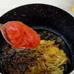 • Meanwhile, prepare the marinade. Peel and grate the apple. Mix it with the soy sauce, tomato paste, and lemon juice.