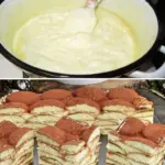• Layer the dessert. Line the bottom of the pan with ladyfingers briefly dipped in coffee (don’t soak them long, they will soften). Spread a third of the cream. Repeat: ladyfingers – cream – ladyfingers – cream – ladyfingers. In total 4 layers of ladyfingers and 3 layers of cream, with the cream ending inside.