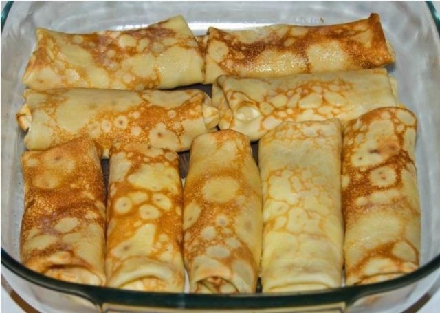 - Assembly and baking: Fill the pancakes with the quark mixture and wrap them as usual (e.g. roll them or fold them into a square). Place the pancakes into a baking dish or casserole. Spread sour cream and melted butter over each layer. Place in a preheated oven at 180°C and bake for 10–15 minutes, until the pancakes are lightly golden.