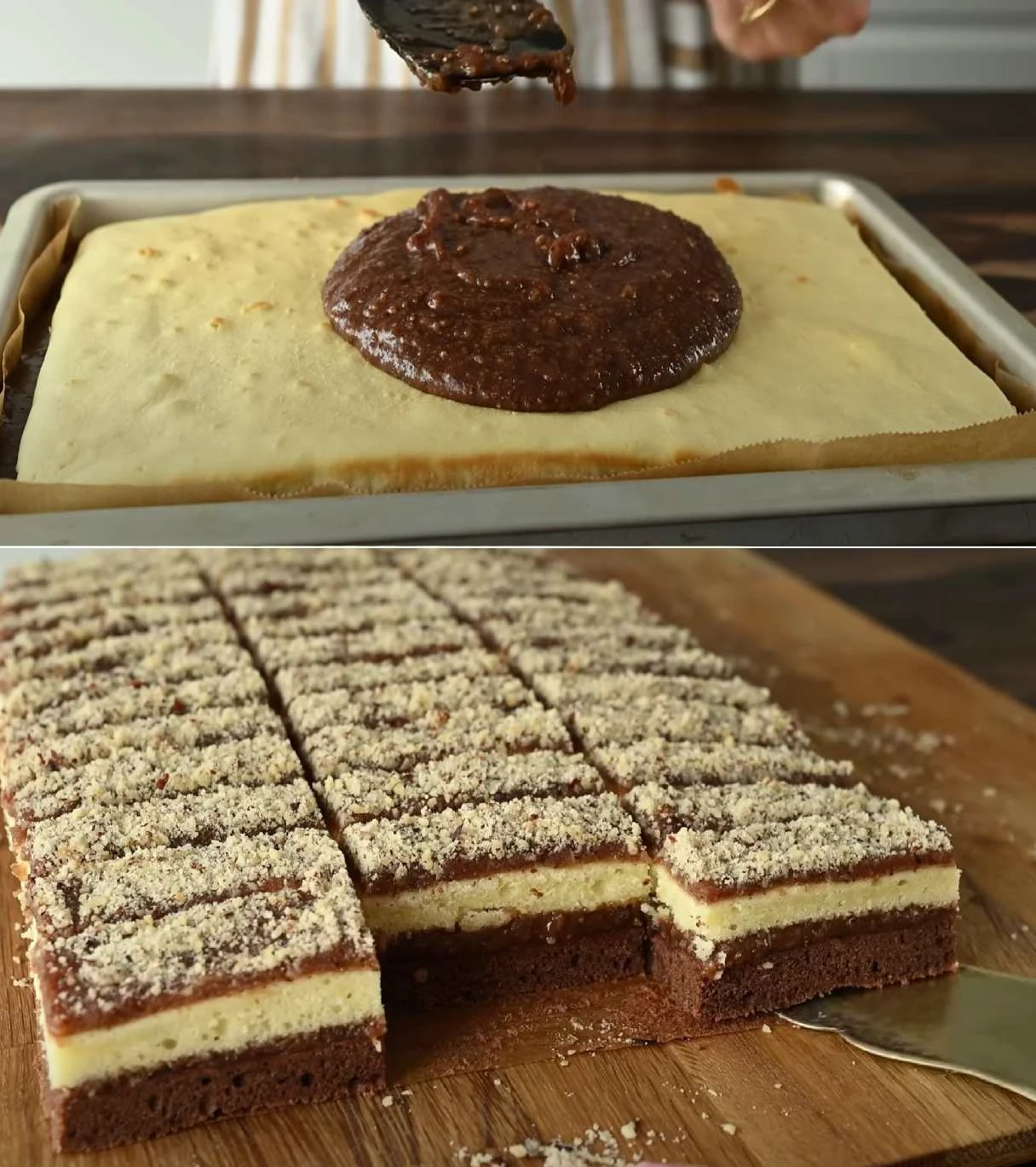 • Dough: Whisk the egg whites with a pinch of salt until stiff peaks form. Beat the butter with the sugar until creamy, gradually beat in the egg yolks and the milk. Mix the flour with the baking powder and fold into the butter mixture. Finally, gently fold in the egg white foam. Spread half of the dough onto a baking tray lined with parchment paper and bake at 180 °C for about 10 minutes until golden. Enrich the other half of the dough with cocoa, spread it on the tray and bake the same way. Let both layers cool.