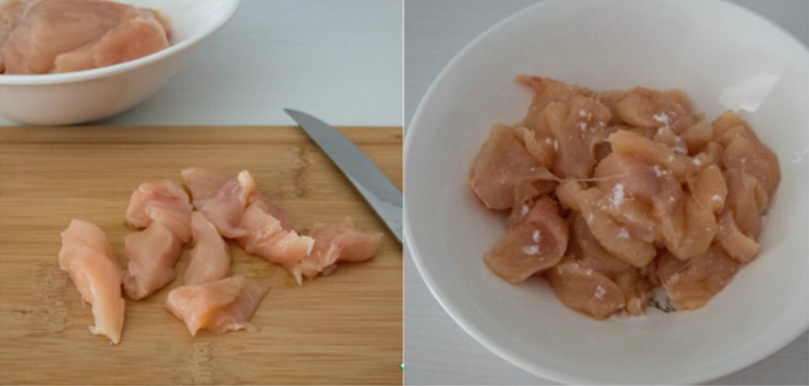 - First wash the chicken breasts, dry them and remove the membranes. Cut them into pieces of any size. You can either prepare traditional cutlets or small nuggets.