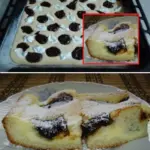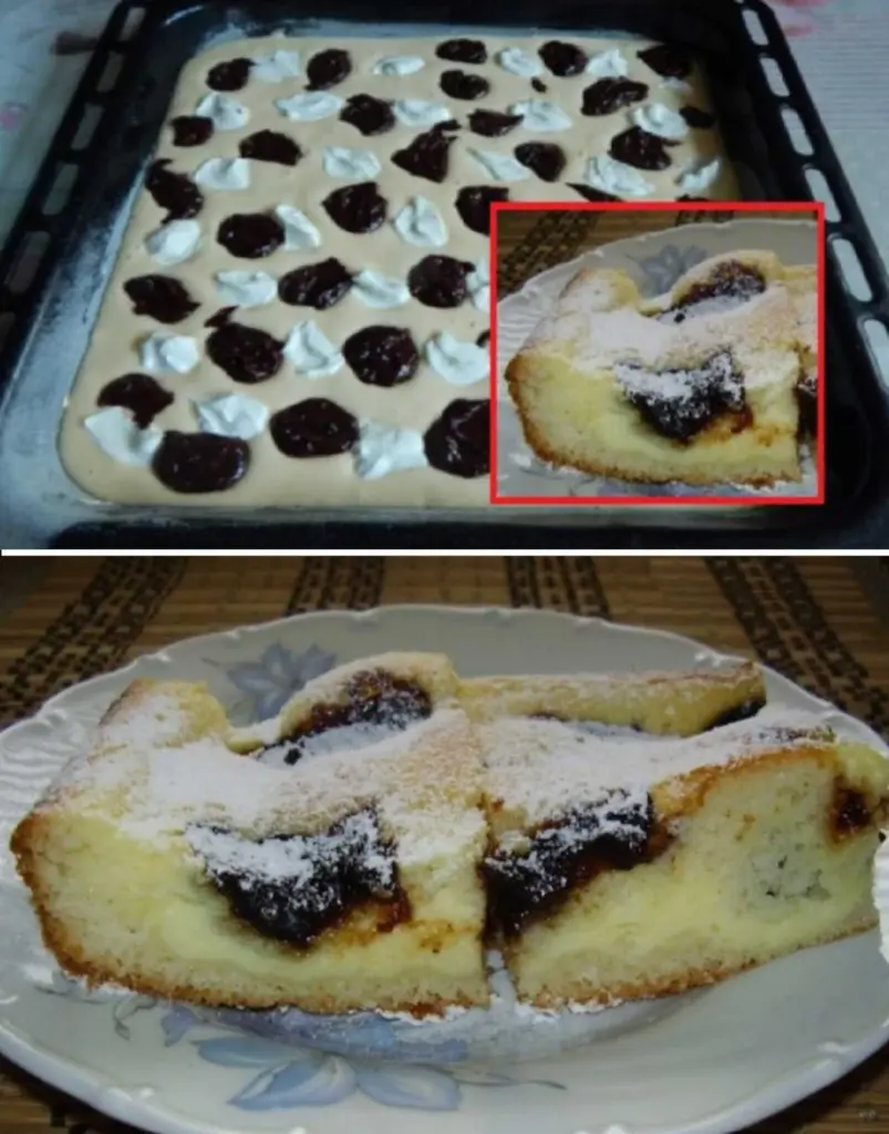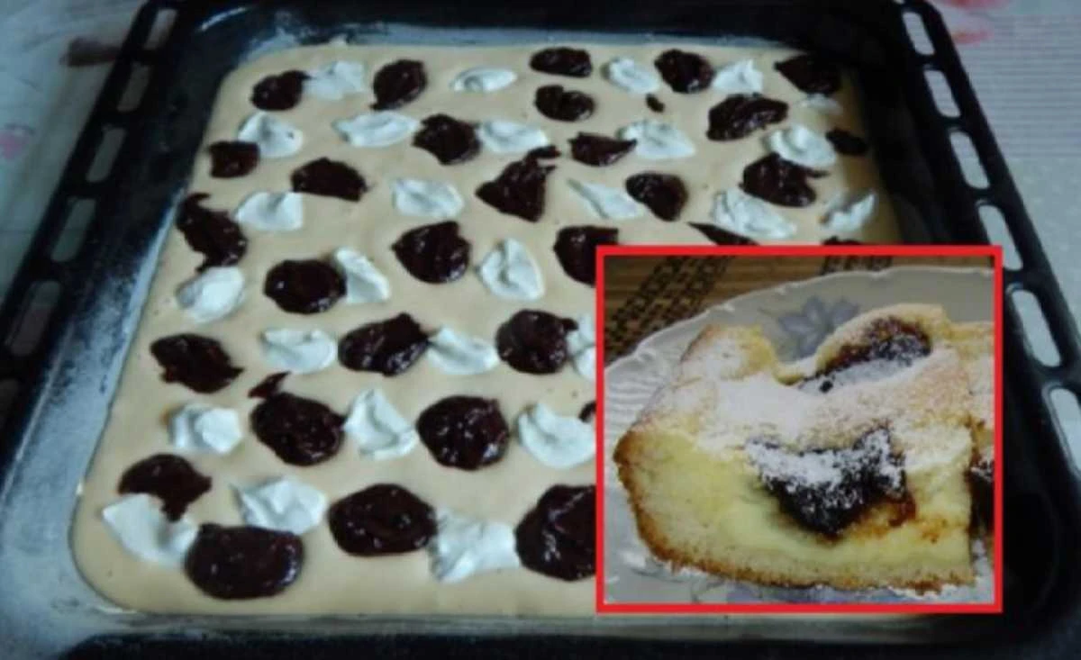 • Adding the quark and jam Mix the quark with the powdered sugar and a small amount of oil. Carefully dot the quark layer onto the batter with small mounds ("fliačky"). Spread the jam over the remaining part of the batter and drop the condensed chocolate.