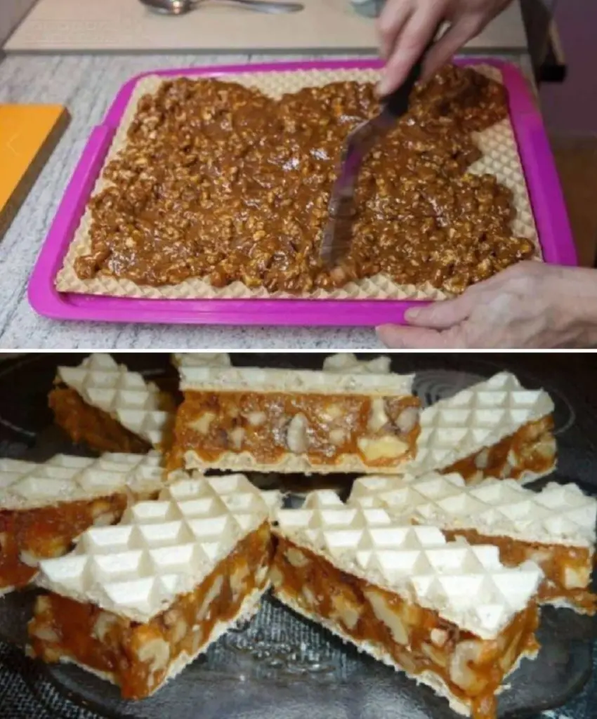 • Forming the layers: Let the mixture cool slightly. Then spread it evenly onto one wafer, cover with the second and press lightly. Place on a flat surface, cover with baking paper and weigh down (e.g., with a cookbook or board). Let set for at least 2 hours.