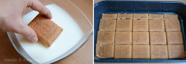 • Preparing the pan: Dip the cookies in milk and arrange them to cover the bottom of a 20 x 30 cm pan.