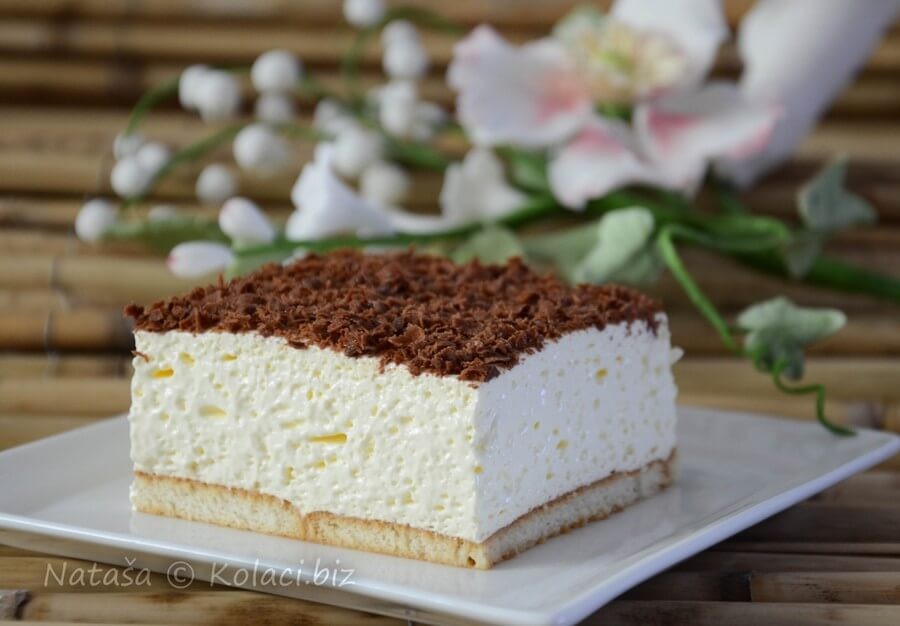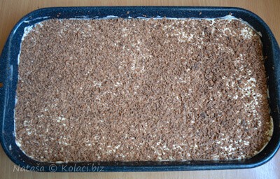 • Finishing the cake: Pour the whipped cream over the prepared cookies and smooth the surface nicely. Sprinkle with grated chocolate and place the cake in the refrigerator, leaving it to set before serving.
