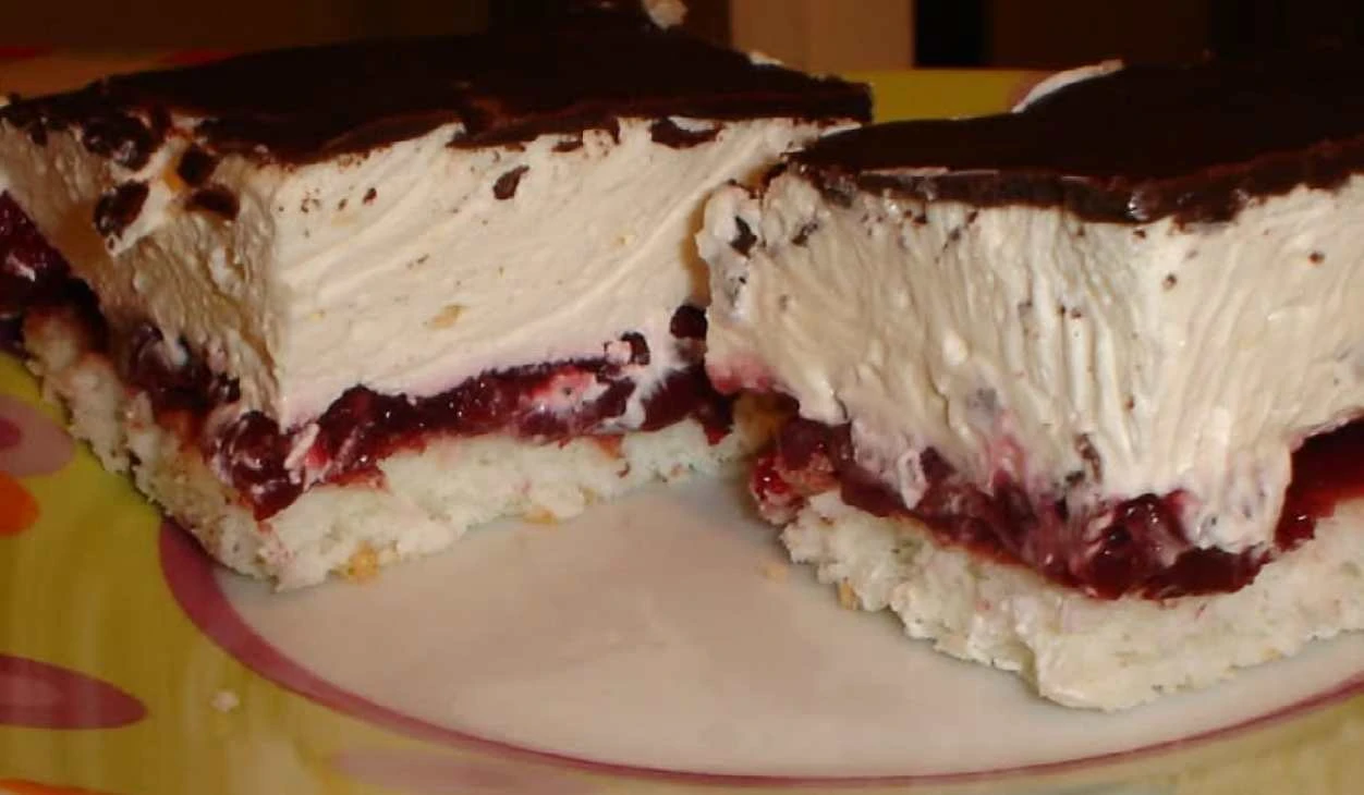 Heavenly cake with cherries, a coconut base and chocolate glaze