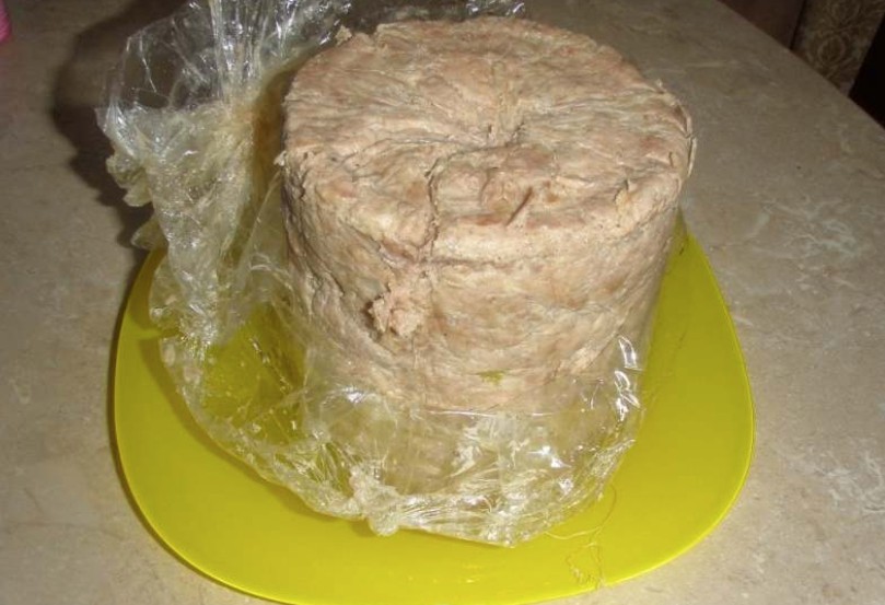 - Rinse the meat, cut it into small pieces, add powdered gelatin to it, herbs, crushed garlic, pepper and salt.