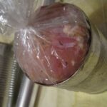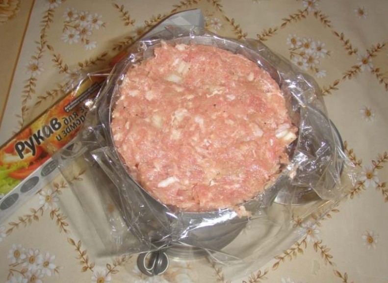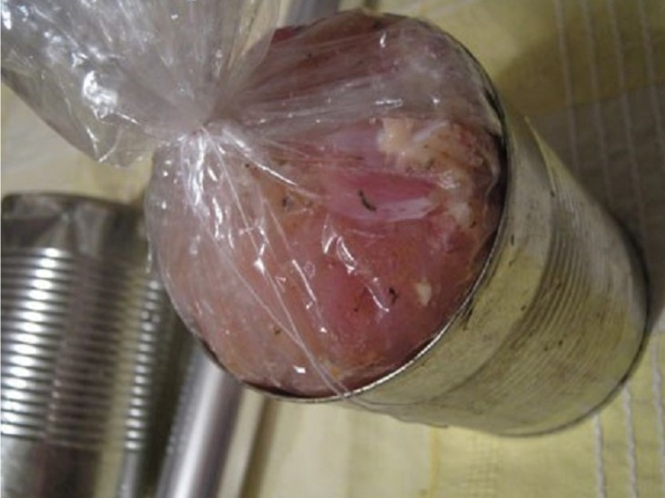 - Place the meat into a baking bag, tie it with string, put it into a can and press it down well.