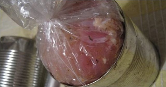 - Place the meat into a baking bag, tie it with string, put it into a can and press it down well.