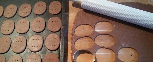 • 2. Shaping and baking: Roll the dough out on a floured work surface to a thickness of approximately 5 mm. Use a cutter to cut out oval shapes and place them on a dry baking sheet. Bake the cookies in a preheated oven at 180 °C for 10 minutes. Let cool.