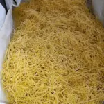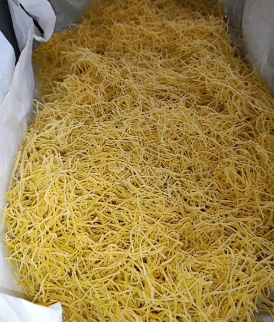 Homemade egg noodles made from 10 eggs and 1 kg of flour are quickly prepared thanks to the simple process and the short rest in the dough. Their texture is tender, drying for just a few tens of minutes is sufficient, and the resulting noodles will bring the taste of a true homemade specialty to your kitchen.