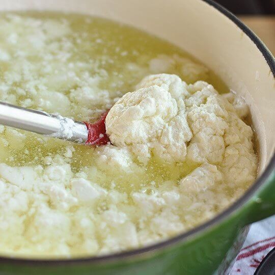 - While you wait, you can prepare another pot of water and bring it to about 90 ° C. All temperatures except for the water can be measured with a regular thermometer. In the pot you can already see how the whey has started to separate. However, if it still has a yellowish color, let it sit a little longer. Once the cheese has a milky color, you can strain it, for example using a sieve.