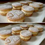 • Rolling and cutting – Roll the dough on a lightly floured surface to about 3 mm thickness. Cut out circles (diameter 4–5 cm) and place on a baking sheet lined with parchment paper.