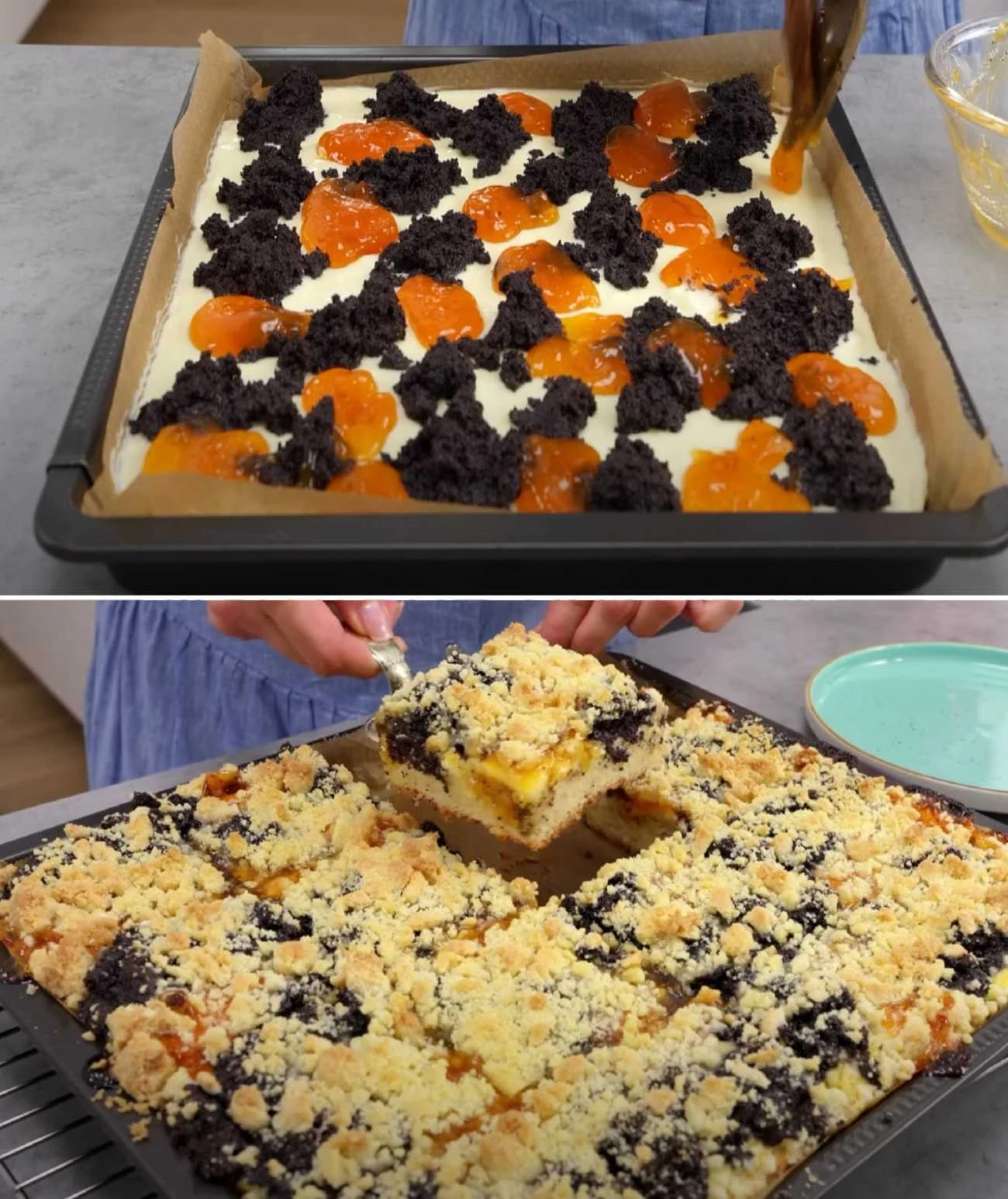 • Assembling the cake: Roll the risen dough out onto a baking sheet lined with parchment paper. Spread first the curd filling, then the poppy seed filling. Brush with apricot jam and sprinkle with the crumble.