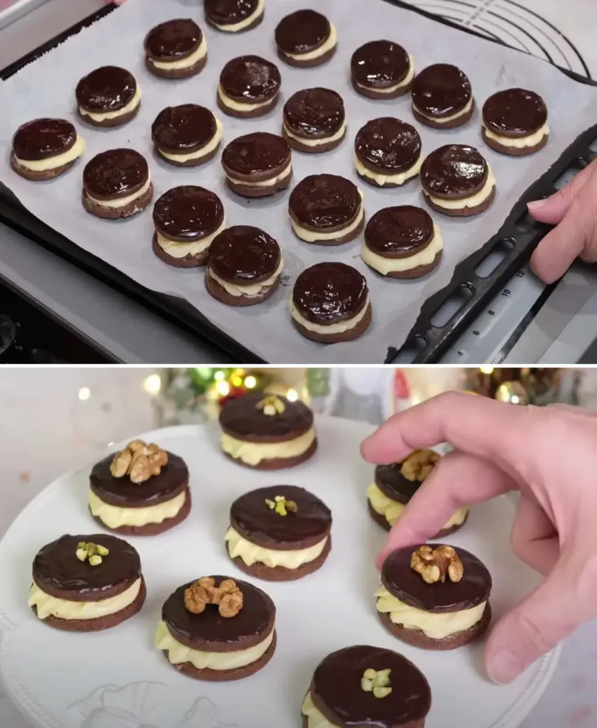 • Melt the chocolate, milk and oil over steam and stir until you have a smooth, glossy glaze. Dip half of the baked rounds into the glaze and, if desired, decorate with pistachios or walnut halves. Pipe the cream onto the non-dipped rounds and top with a chocolate-covered round. Store the finished cookies in the cold, where they will set nicely.