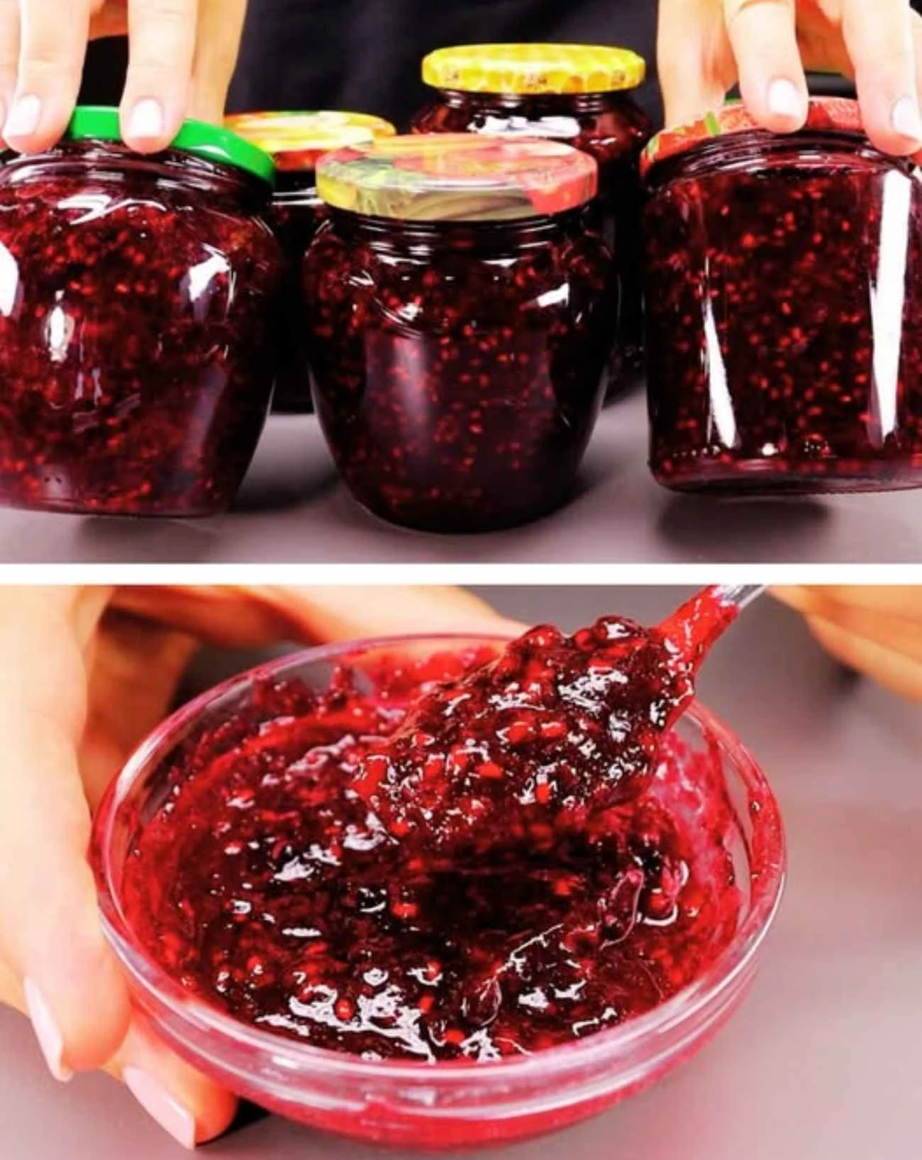 • Filling the jars Pour the hot jam into sterilized jars, close tightly, turn upside down and let cool. The lids will seal by themselves.