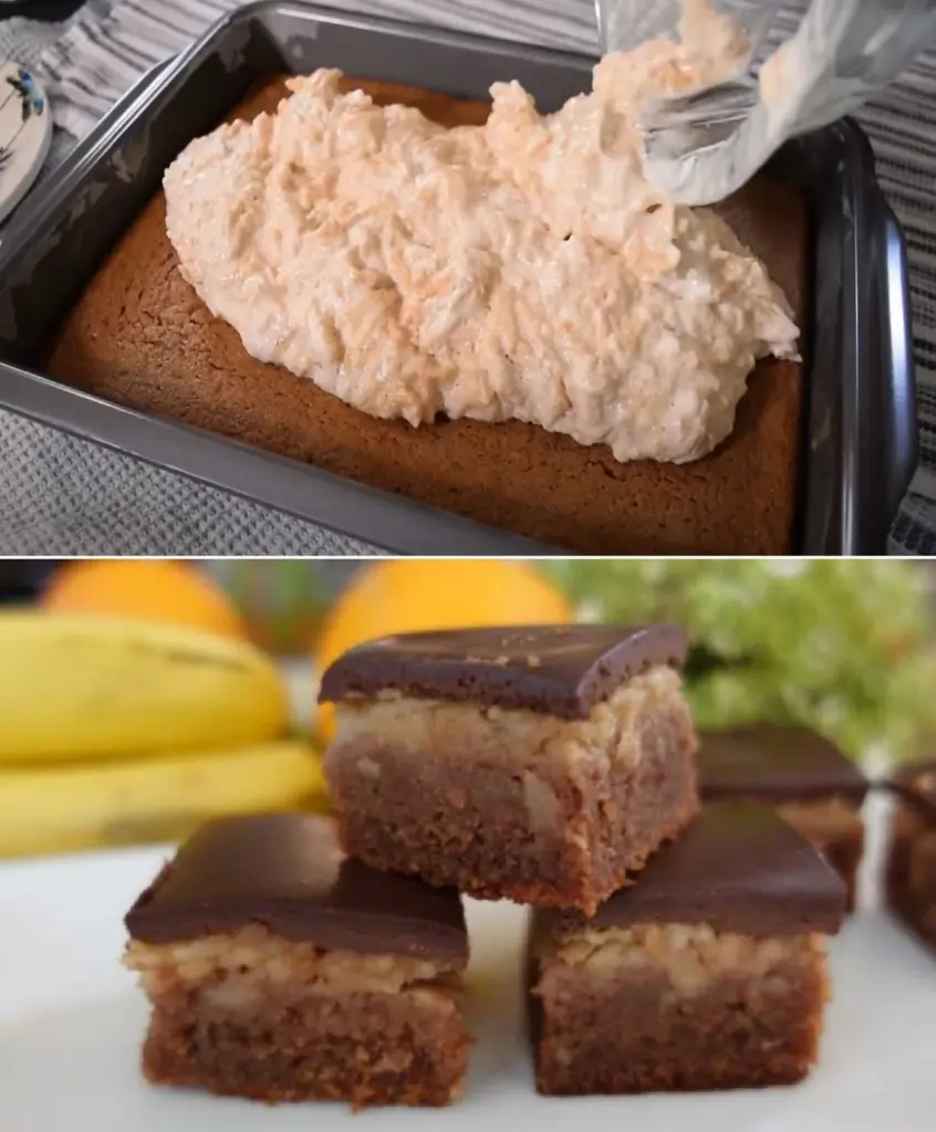 • Finishing: Let the baked cake cool for 10 minutes, then pour the ganache over it and place it in the refrigerator for at least 30 minutes to allow the chocolate to set. Cut into portions.