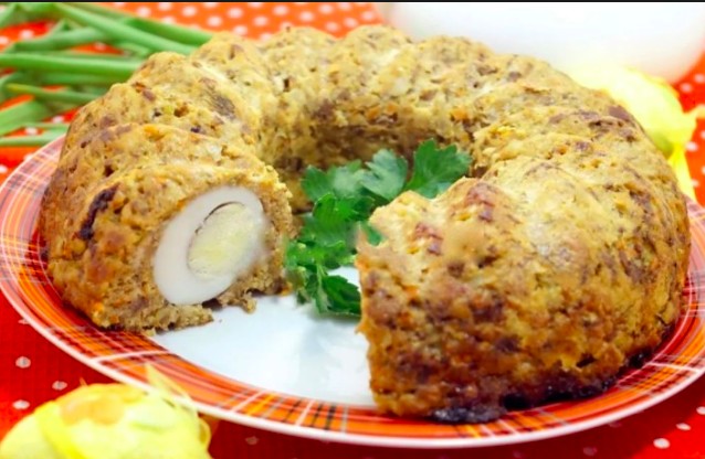 - We boil the remaining five eggs hard and after cooking we peel them cold. We prepare a baking dish (like for a bundt cake) and grease it with oil. Then we press some of the mixture into the bottom and arrange the cooked eggs around it. Next we cover them with the remaining mixture, level it and finally brush with oil.