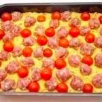 5. Place the meatballs on the potatoes.Finally fill the spaces between the balls with cherry tomatoes.
