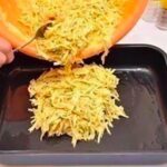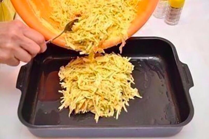 4. <li.Grease the baking sheet with oil. Cover the bottom of the baking dish with the potato mixture. Smooth it out.