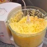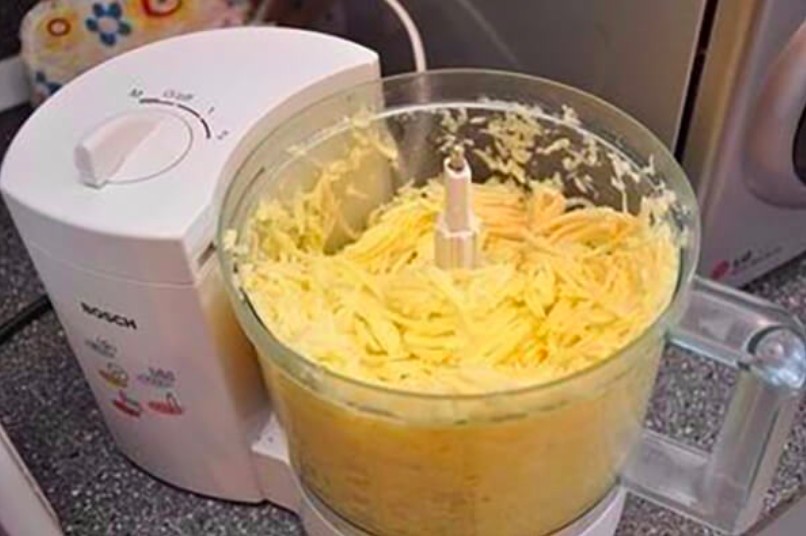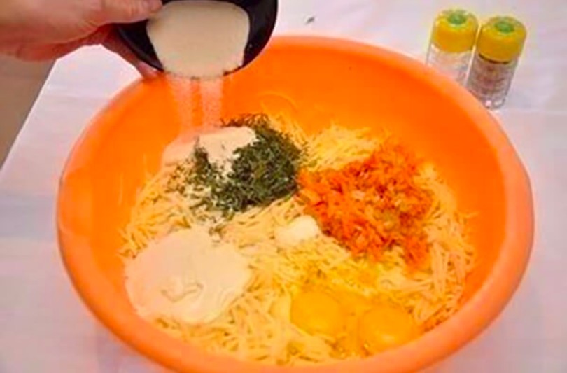 2. Then mix the mayonnaise, mustard, carrot, eggs, semolina and season with salt, turmeric and pepper. Now mix everything, except the meat of course, with the grated potatoes. Mix well.