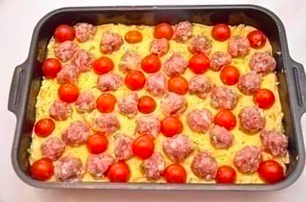 5. Place the meatballs on the potatoes.Finally fill the spaces between the balls with cherry tomatoes.