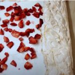 • Combining the cream and the dough: Turn the cooled base over and spread the prepared cream on the underside. Sprinkle with pieces of strawberries.