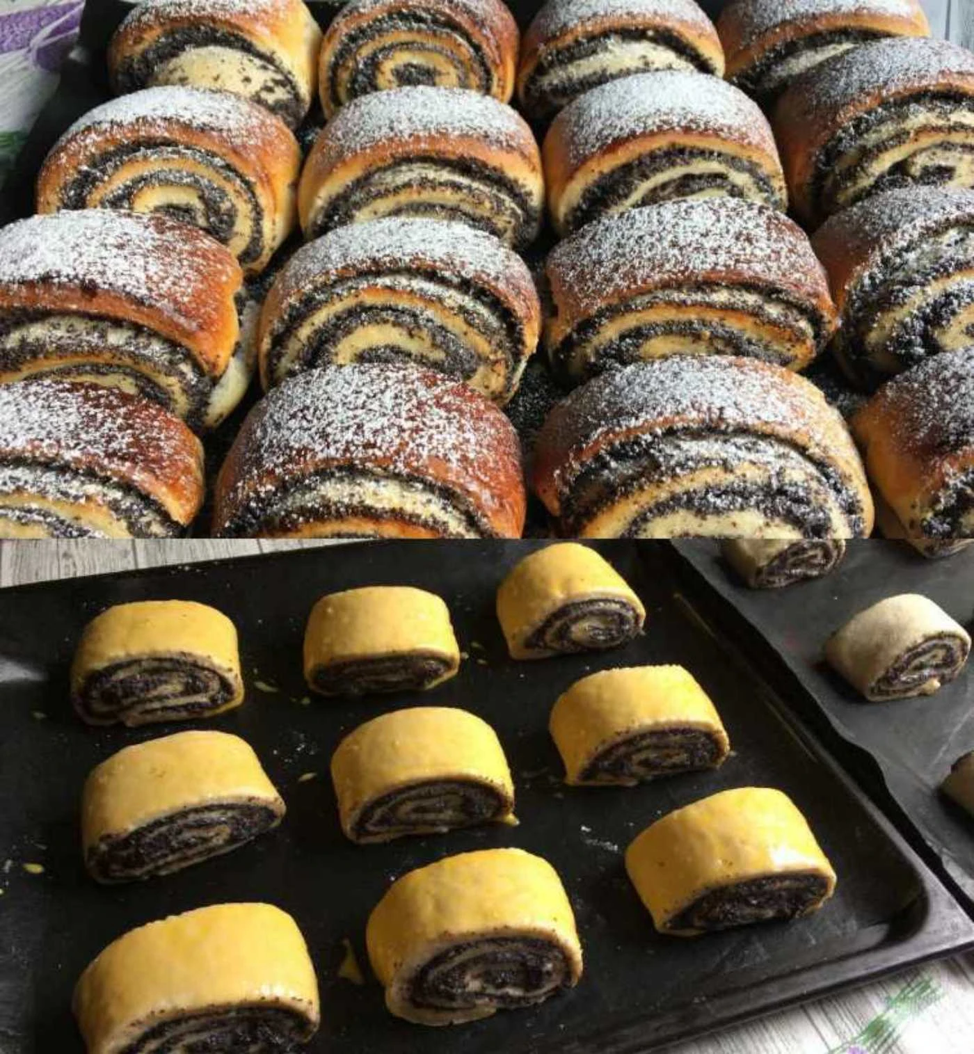• Shaping: divide the risen dough into two halves. roll each into a thin rectangle, spread the poppy filling evenly, roll up from the long side and cut mini rolls with a sharp knife (approx. 3–4 cm). place on baking sheets lined with parchment paper.