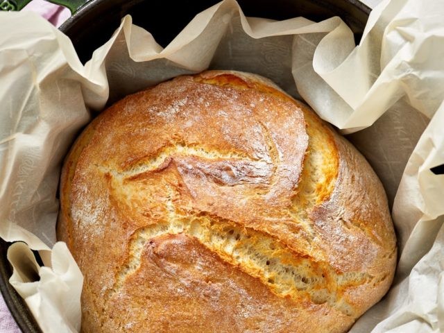 - Carefully transfer the risen dough on the baking paper into the hot pot or roasting pan, cover and bake for 30 minutes.
