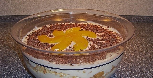 • 4. Assembling the dessert: Crumble the sponge biscuits or butter cookies into smaller pieces. Layer them alternately with the cream and pieces of mandarin in dessert glasses or a bowl.