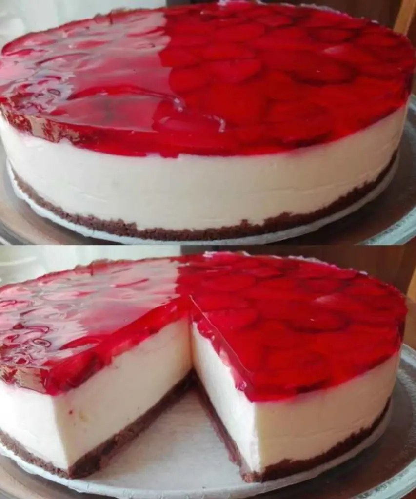 • Strawberries and jelly: Slice the strawberries and arrange them on the set cream. Prepare the strawberry cake jelly exactly according to the package instructions and, after it has cooled slightly, pour it over the strawberries in a thin layer. Let it set in the refrigerator for at least 60 minutes.