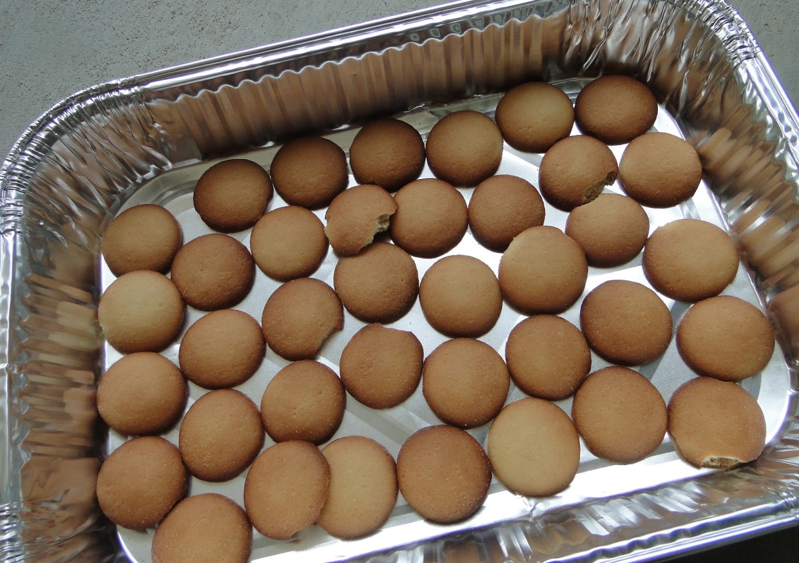 - Preparing the pan: You can prepare the dessert in a regular baking pan or in an aluminum foil grill pan. Line the bottom of the pan with baby sponge biscuits.