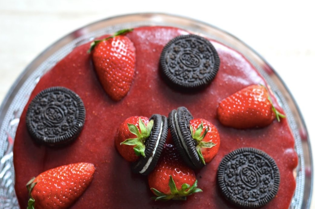- Add the prepared strawberry mixture and bake at 180 degrees for 35 minutes or until the cake is slightly jiggly.