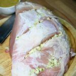 - It's best to let the meat marinate overnight. We wash the meat, dry it, make slits, marinate it and let it sit for 24 hours. The following day just put the meat into an oven preheated to 180 ° and bake for about 1.5-2 hours. To prepare the marinade for the meat mix 3 tablespoons each of spicy and regular mustard, a tablespoon of honey, salt, pepper and hot paprika. You can also add a little water to the marinade. Peel the garlic and chop it into small pieces. Fill the cut meat with the chopped garlic, as in the picture below.
