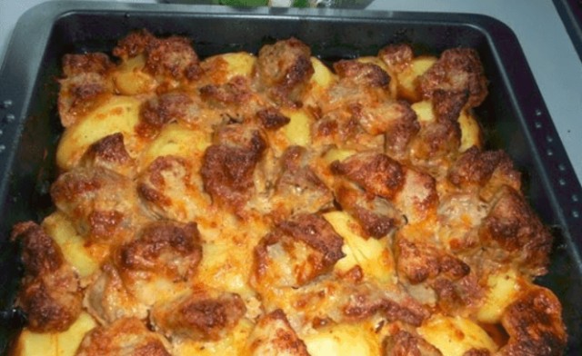 - Adding the meat: Add the marinated pork neck, including the marinade, on top of the potatoes and onions.