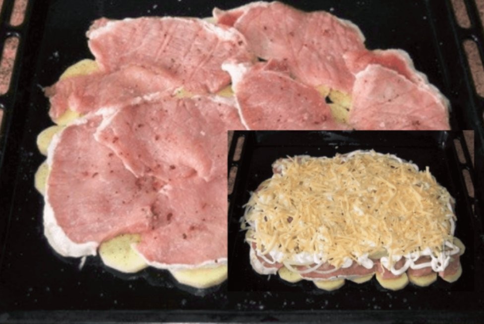 • Place the onion rings on the potatoes and finally lay the meat on top.