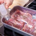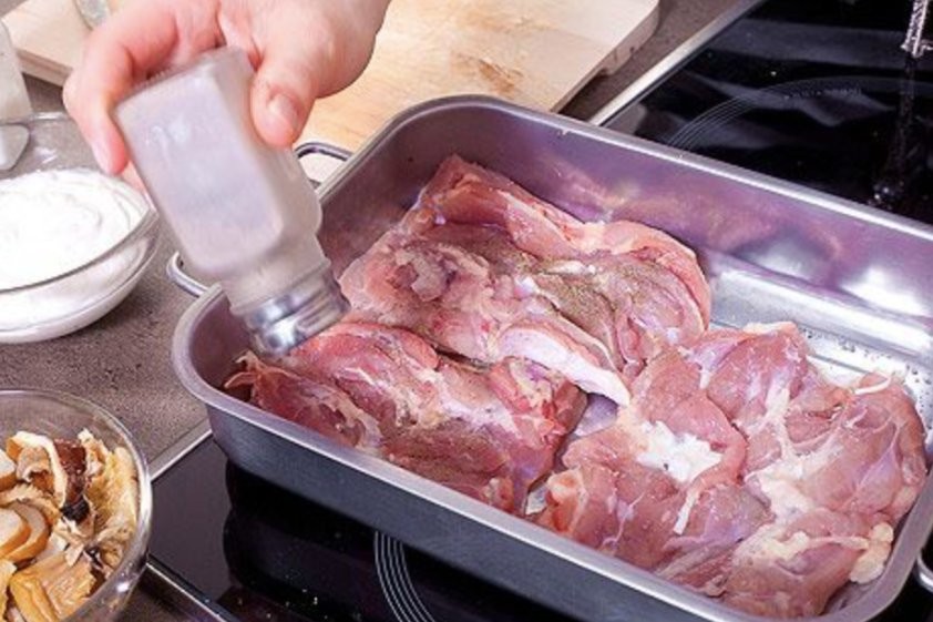 • Mix mayonnaise and sour cream in a 2:1 ratio, add the crushed garlic and spread over the meat.