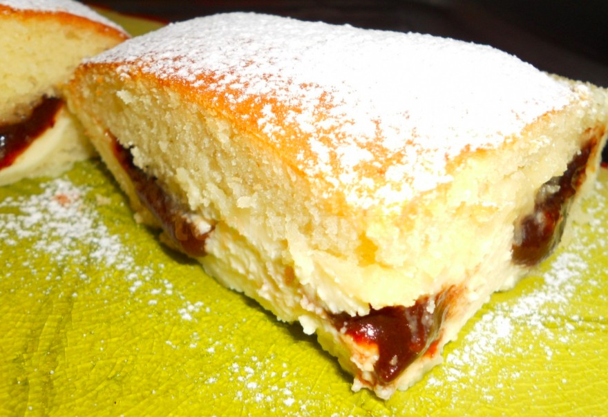 - Prepare a baking tray measuring 25x35cm, which we line with baking paper. Spread 1/2 of the batter on the tray, then the quark filling on the batter, on which we spoon the plum jam in layers as if we were placing fruit on it.