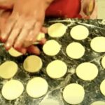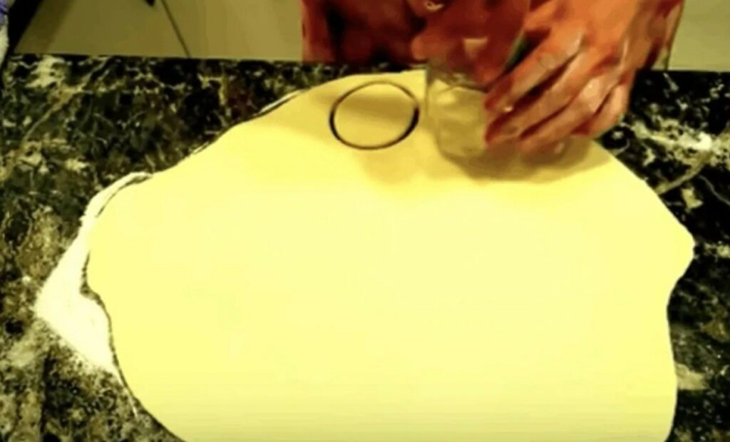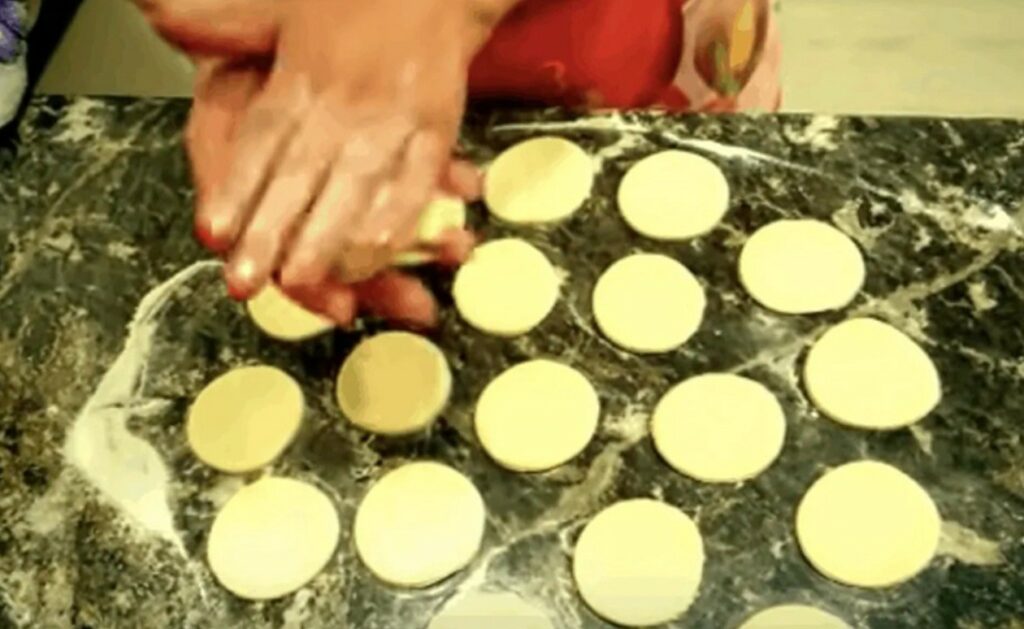 - Roll the dough out into a sheet 4 mm thick. From the sheet cut circles 7 cm in diameter. Immediately coat each circle in sugar, then fold in half, fold in half once more, and coat in sugar again.