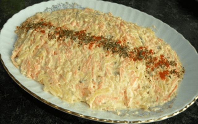 • Preparation of the vegetables: Boil the potatoes in their skins, let them cool and then grate them on a grater or press them through a sieve as for a classic potato salad. Briefly boil the carrot, let it cool and also grate it (if you want, you can use pickled carrot drained of brine).