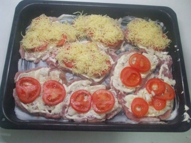 - Vegetables and cheese: Slice the tomatoes into rounds and place them on the cutlets. Finally, sprinkle everything with grated cheese.