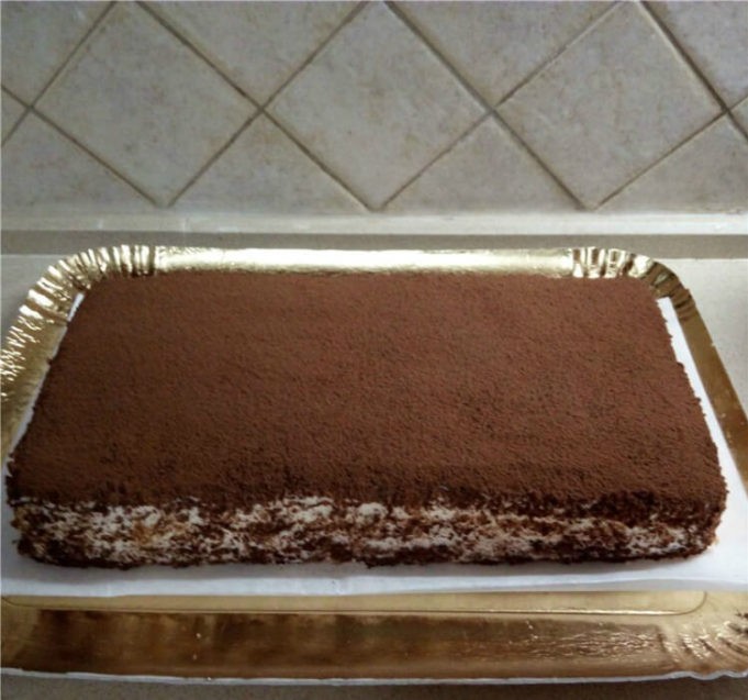 - Assembling the dessert: After it cools, cut the base in half. Spread a layer of cream on the first layer, then place the second layer on top. Spread the remaining cream over the top and smooth it nicely with a knife. Finally, sprinkle the dessert with cocoa.