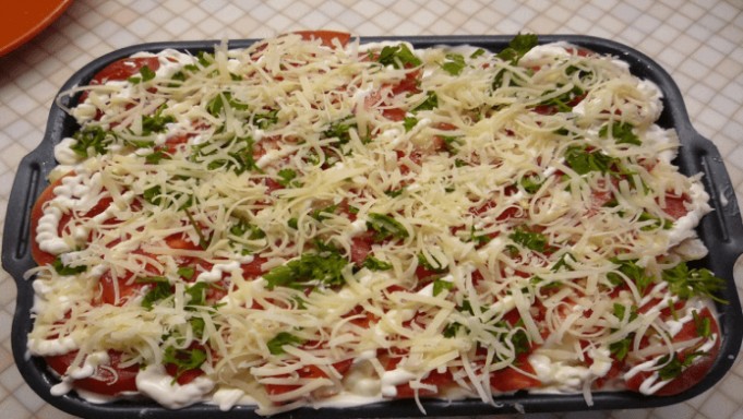 - Assembling the layered dish: Grease the baking tray with butter. Place a layer of sliced potatoes on the bottom of the tray. Put a layer of chicken on the potatoes, then a layer of onion, cauliflower, and finally tomatoes. Pour the prepared cream mixture over and sprinkle with grated cheese.