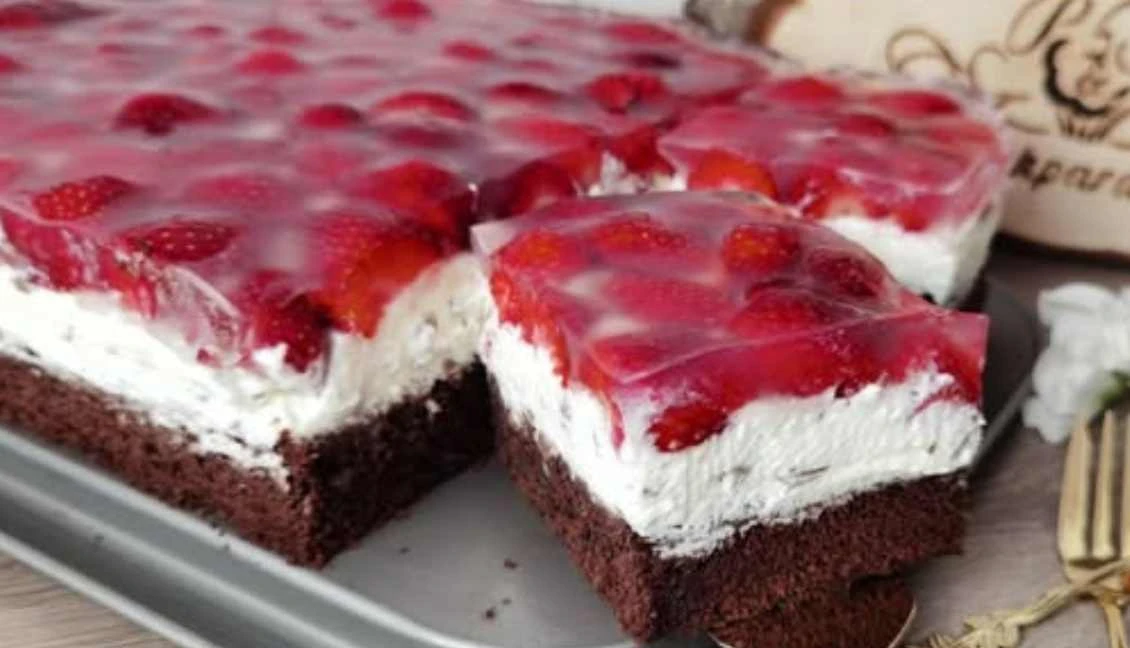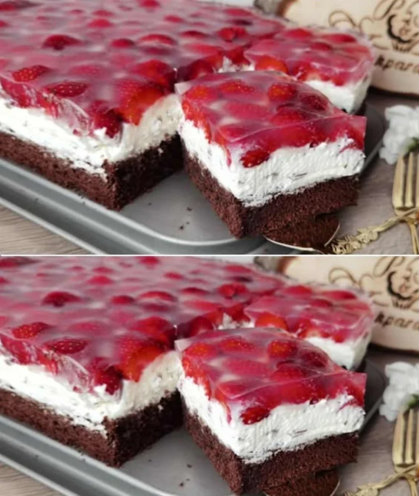 This refreshing strawberry cake is the perfect combination of a moist cocoa sponge, a delicate mascarpone cream and juicy strawberries. Thanks to its simple preparation and impressive appearance, it will become the star of any celebration or summer gathering. If you are looking for a dessert that combines taste and lightness, you’ve just found it.