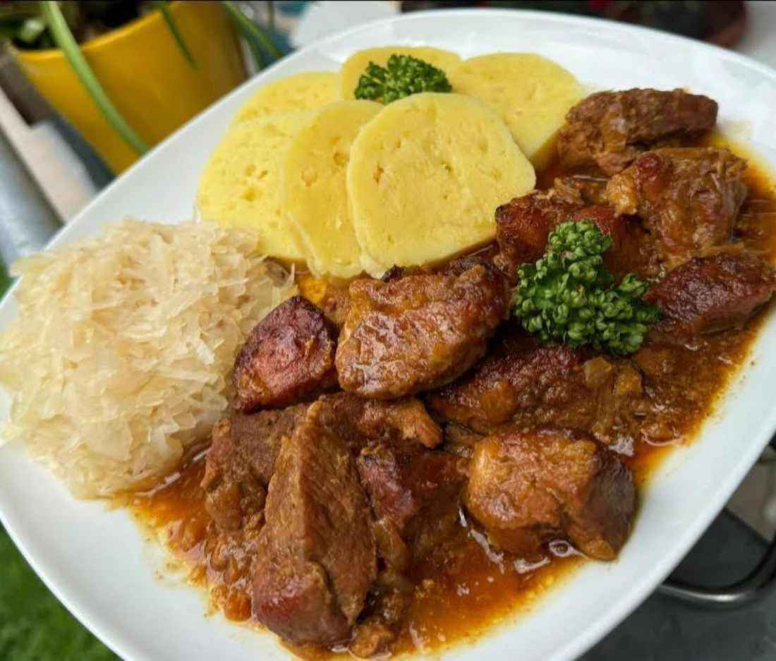 Roast pork belly and neck with homemade potato dumplings and braised cabbage represent a traditional Czech treat that warms both body and soul. Thanks to the beer gravy the meat is juicy and well seasoned, while the fluffy dumplings and tender cabbage complete the dish for a hearty lunch or festive dinner. Make this recipe over the weekend and enjoy true Czech hospitality.